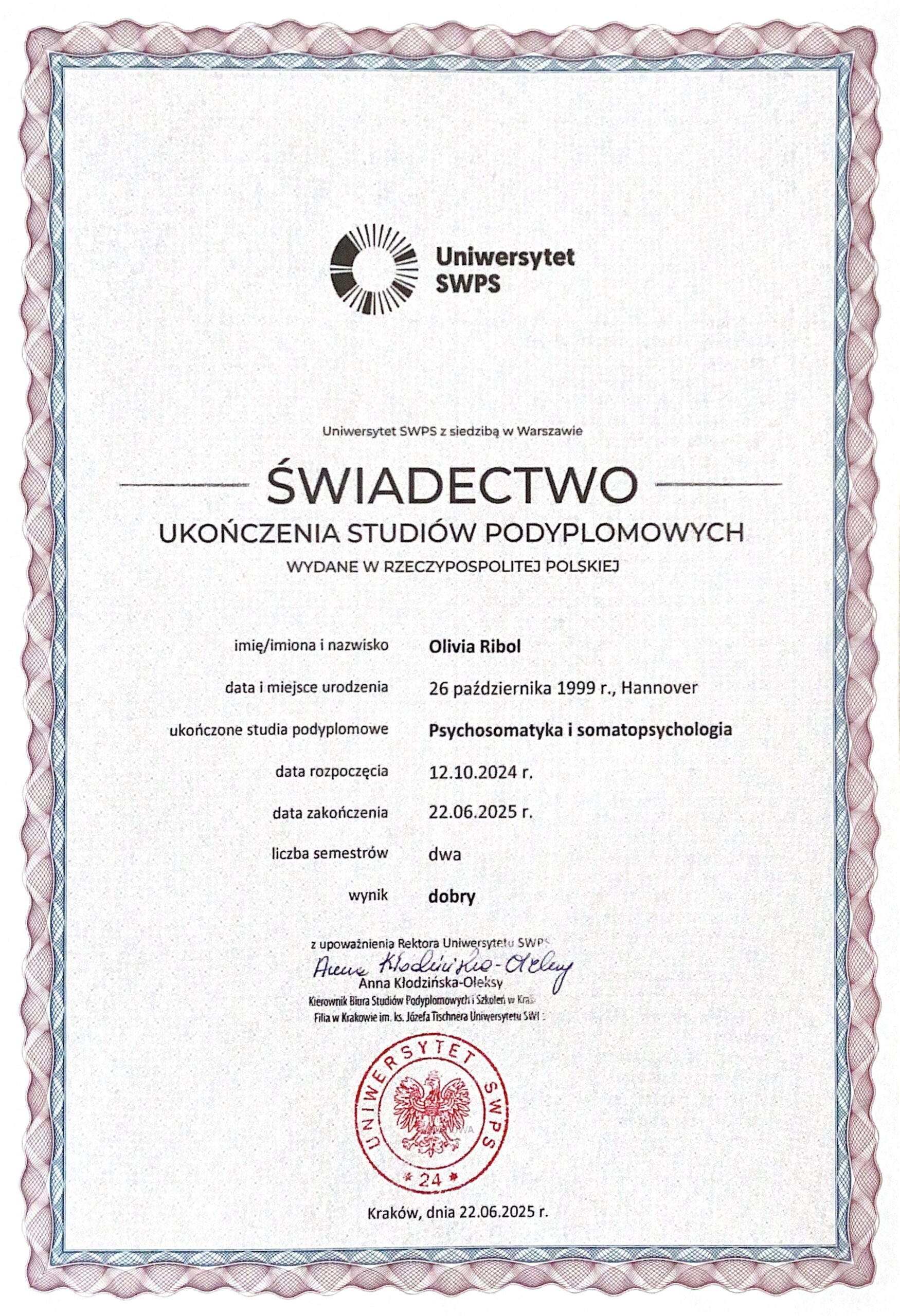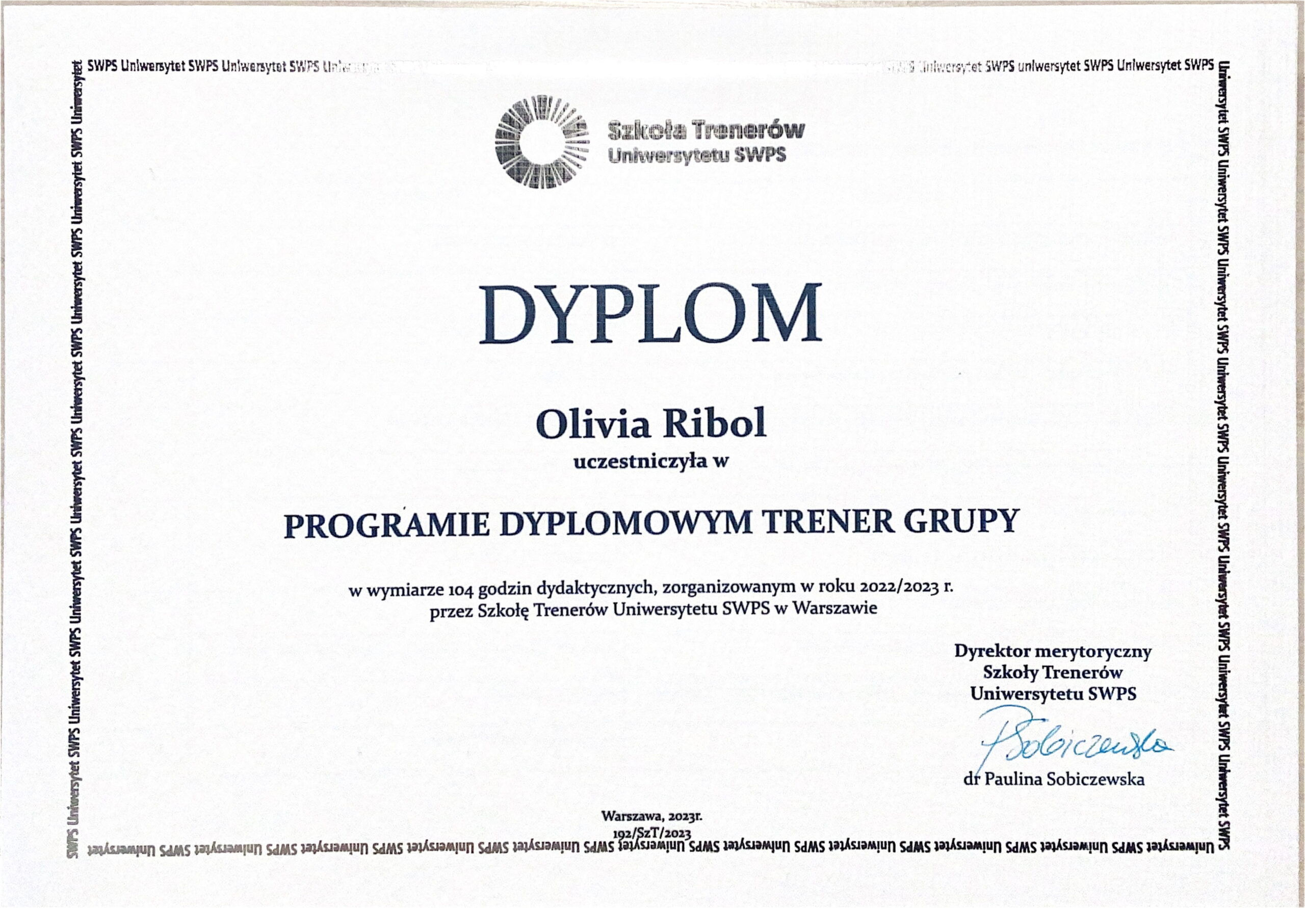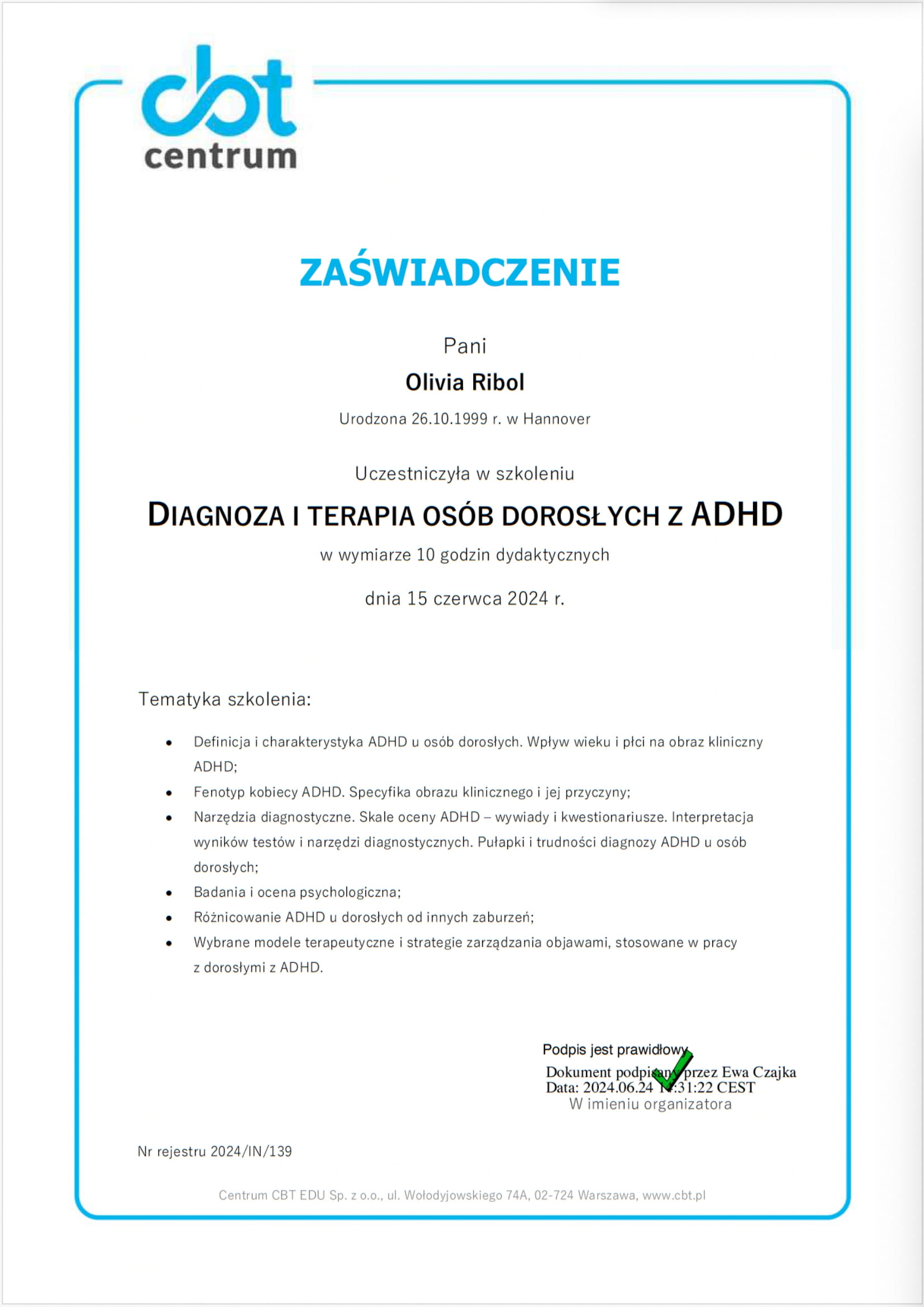 „Z Panią Olivią Ribol zaczęłam pracę nad emocjami a zmiany wprowadzam i zauważam po każdym spotkaniu. Pani Olivia jest bardzo serdeczną i punktualną osobą”